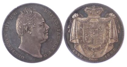 An undated Pattern Crown has been recorded of the same style with potentially 3-4 examples known, of the highest rarity. A Pattern Crown undated struck in lead, perhaps unique, has been noted (Nobleman Sale – 1922, lot 214, £9 ‘extremely fine and probably unique’). The 1831 Proof Crown still considered very rare, is the entry level Crown in this particular series, these would have initially been issued as part of the 14 coin Coronation Proof Set, we also have a complete 1831 Proof set in our live stock at present. An 1831 Crown struck in Gold had also been minted with an equivalent rarity to our 1834 Crown in Silver; this being the R5 designation, attributed by P.Alan Rayner in his comprehensive book ‘English Silver Coinage since 1649.’