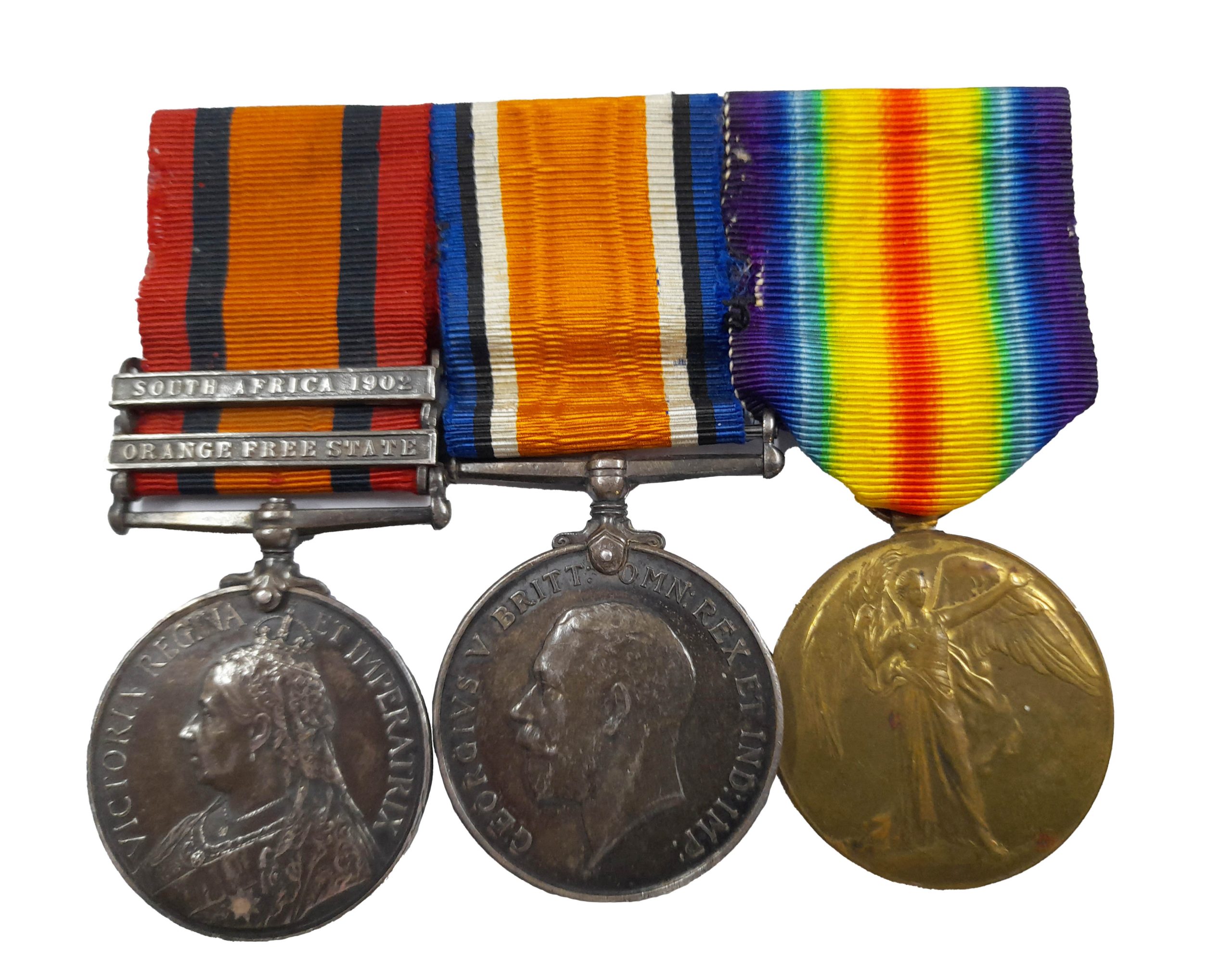 A Boer War Royal Engineer and Great War South African Horse and South African Service Corps Trio awarded to Corporal Jack Snape who bought himself out of the Engineers for £18 in 1903 and was awarded £9 back when he re-joined the 4th South African Horse on the 14th of January 1916 comprising, Queen’s South Africa Medal, 3rd type, two clasps, Orange Free State, South Africa 1902, 1914-1920, (4819 Spr. J. Snape. R.E.) British War and Victory Medals – South African Bi-lingual Victory Medal Reverse, (Cpl J. Snape. S.A.S.C.), contemporarily mounted for wear, heavily toned, very fine.
