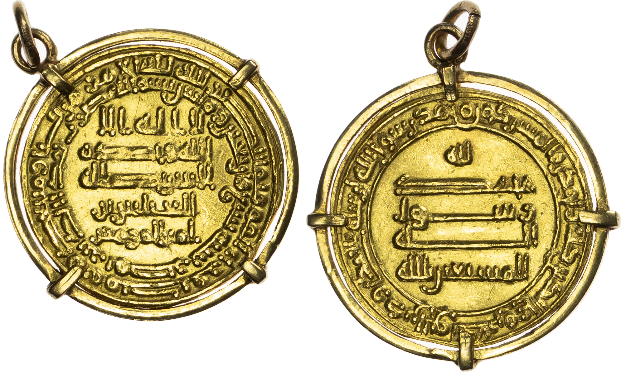 Abbasid, al-Muqtadir (AH 295-320 / 908-932 AD), gold Dinar, Misr, 5.66g (A. 245.5). About Extremely Fine, mounted.