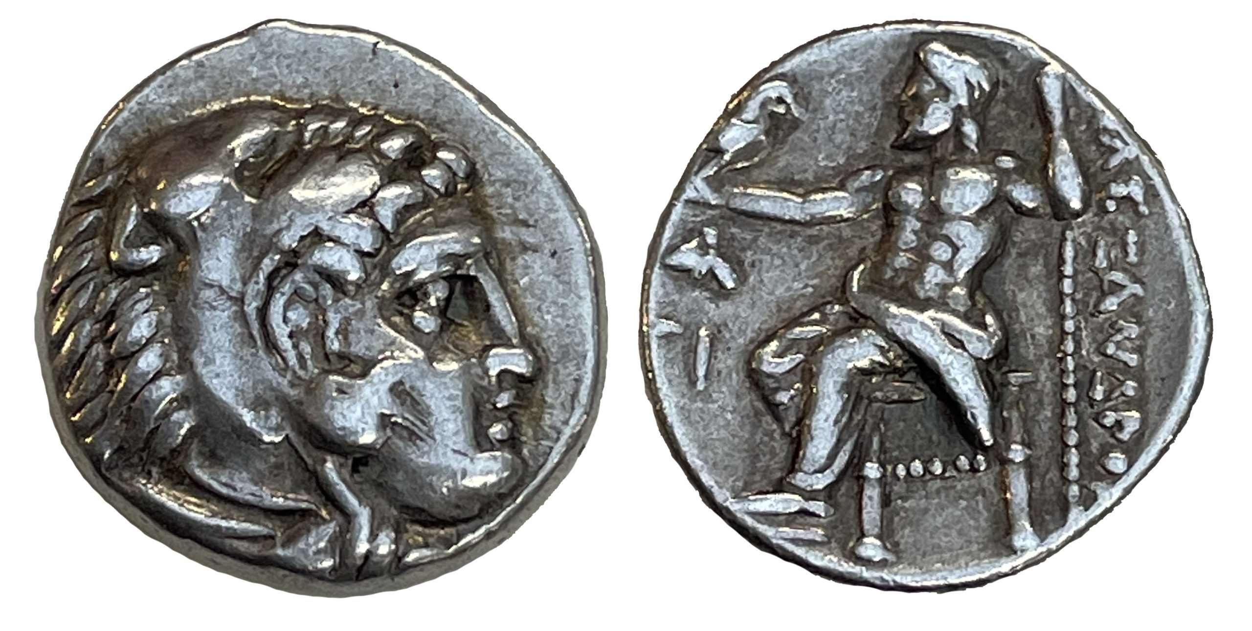 Alexander the Great (336-323 BC), Silver Drachm, Sardis, posthumous issue, c. 323-319 BC, 4.25g. Obverse: Head of Herakles right, wearing a lionskin headdress. Reverse: Zeus seated left, holding eagle and… Read more