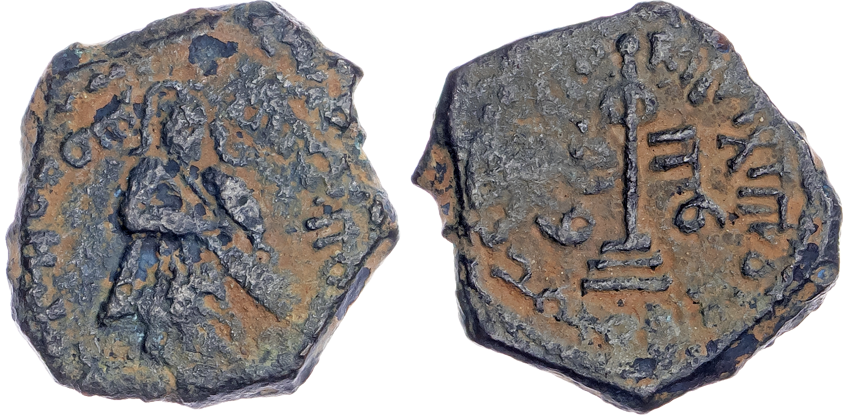 Arab-Byzantine, temp. Abd al-Malik (AH 65 86 / 685 705 AD), bronze Fals, Standing Caliph type, Tanukh, 4.90g (A-3531). Very Fine, uneven cut flan. Very rare.