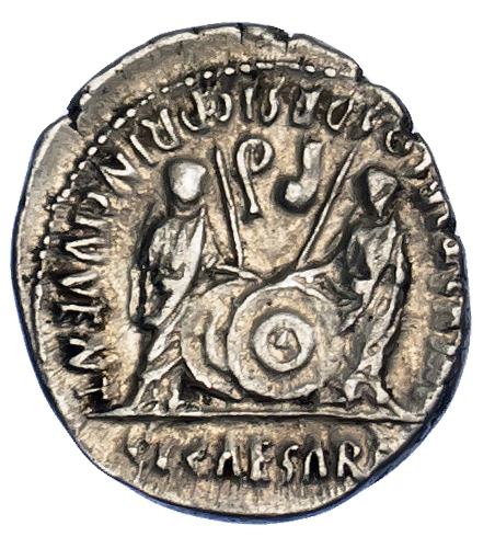 Reverse: C L CAESARE[S AVGVSTI F CO[S DESIG PRINC IVVENT], Gaius and Lucius Caesars standing facing, with honorary shields and spears; above, lituus and simpulum.