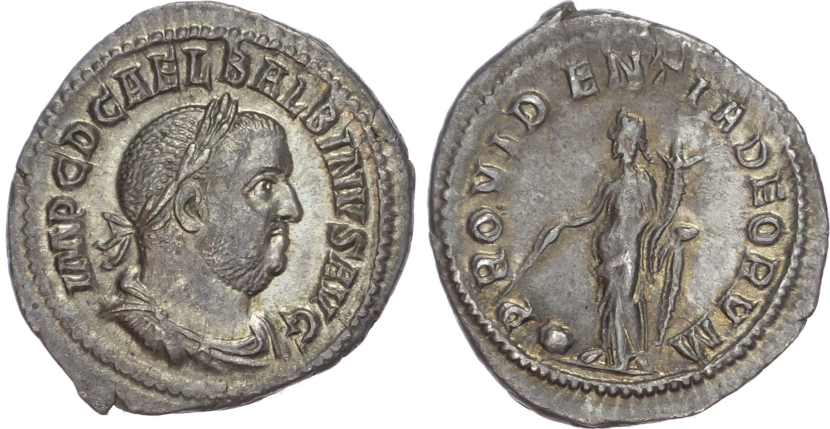Balbinus (AD 238) Silver Denarius, Rome, 2.82g. Obverse: IMP C D AEL BALBINVS AVG, laureate, draped and cuirassed bust of Balbinus right. Reverse: PROVIDENTIA DEORVM, Providentia standing left, holding wand over globe, and cornucopiae. (RIC 7; BMC 33). Good Very Fine. Pleasing cabinet tone.