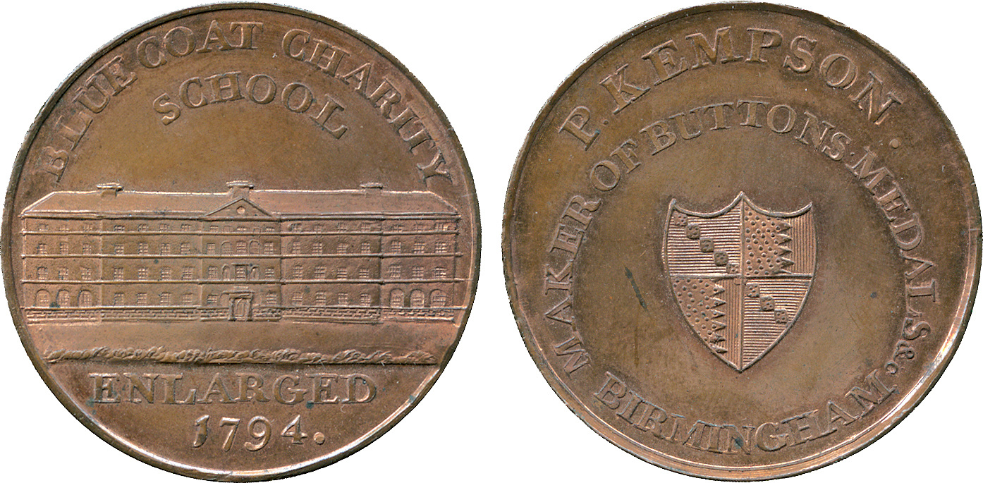 Great Britain, Warwickshire, Birmingham, Peter Kempson (1755-1824, buttonmaker, later token manufacturer, at St Mary’s Row, Birmingham, later Little Charles Street; he was actively involved in the production of tokens from 1791 until 1799, turning out more than 60 tons of “legitimate provincial coins” for various commissions, and freely muled dies in his possession, producing a variety of tokens for sale to collectors), Copper Halfpenny Trade Token, undated (c.1797), obverse: a large building, BLUE COAT CHARITY SCHOOL above, ENLARGED 1794 in exergue (The Blue Coat School is a preparatory school for children aged 2 to 11; the school was founded in 1722, in 1930 it moved from the northeast corner of St Philip’s Square to its current location on Somerset Road, on the border between Edgbaston and Harborne), reverse: type three, shield of arms, MAKER OF BUTTONS MEDALS &c. BIRMINGHAM around, P. KEMPSON. above, P of P. KEMPSON aligns over space between O and F of OF, stop after KEMPSON, edge PAYABLE AT YORK, diam. 29mm (Dalton & Hamer “The Provincial Token Coinage of the 18th Century” 197).