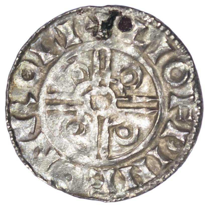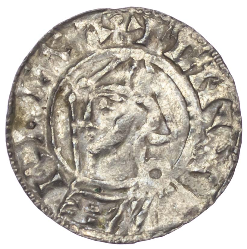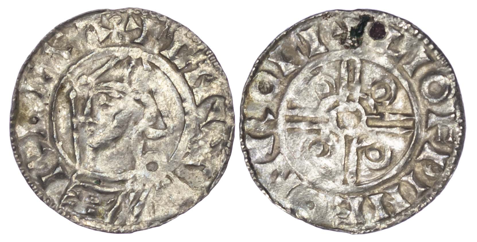 Canute (1016-35), helmet type Penny (1024-30), Leofwine of Rochester Mint, helmeted bust left with sceptre to edge of coin, linear circle surrounding, legend commences at top, +CNVT: RECX rev. short voided cross with pellet and annulet centre, pellets in annulet in each angle, all within linear circle, +LIOFPINE ON ROFI 0.75g. (N.787; S.1158).