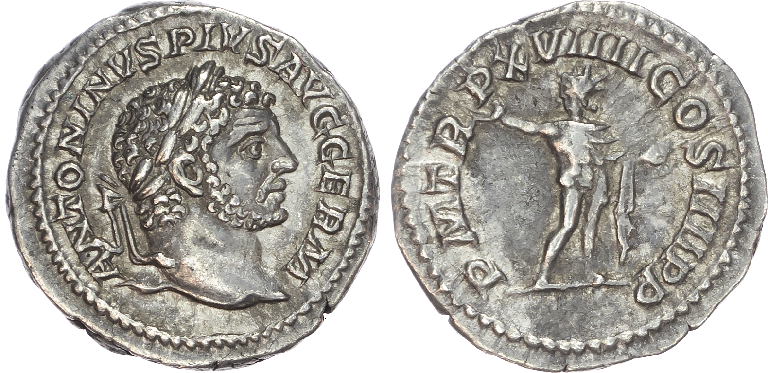 Caracalla (AD 198-217) Silver Denarius, Rome, AD 216, 2.83g. Obverse: ANTONINVS PIVS AVG GERM, laureate head of Caracalla right. Reverse: PM TR P XVIIII COS IIII P P, Sol standing right, head left, holding globe and raising hand. (RIC 281b; BMC 172). Good Very Fine.