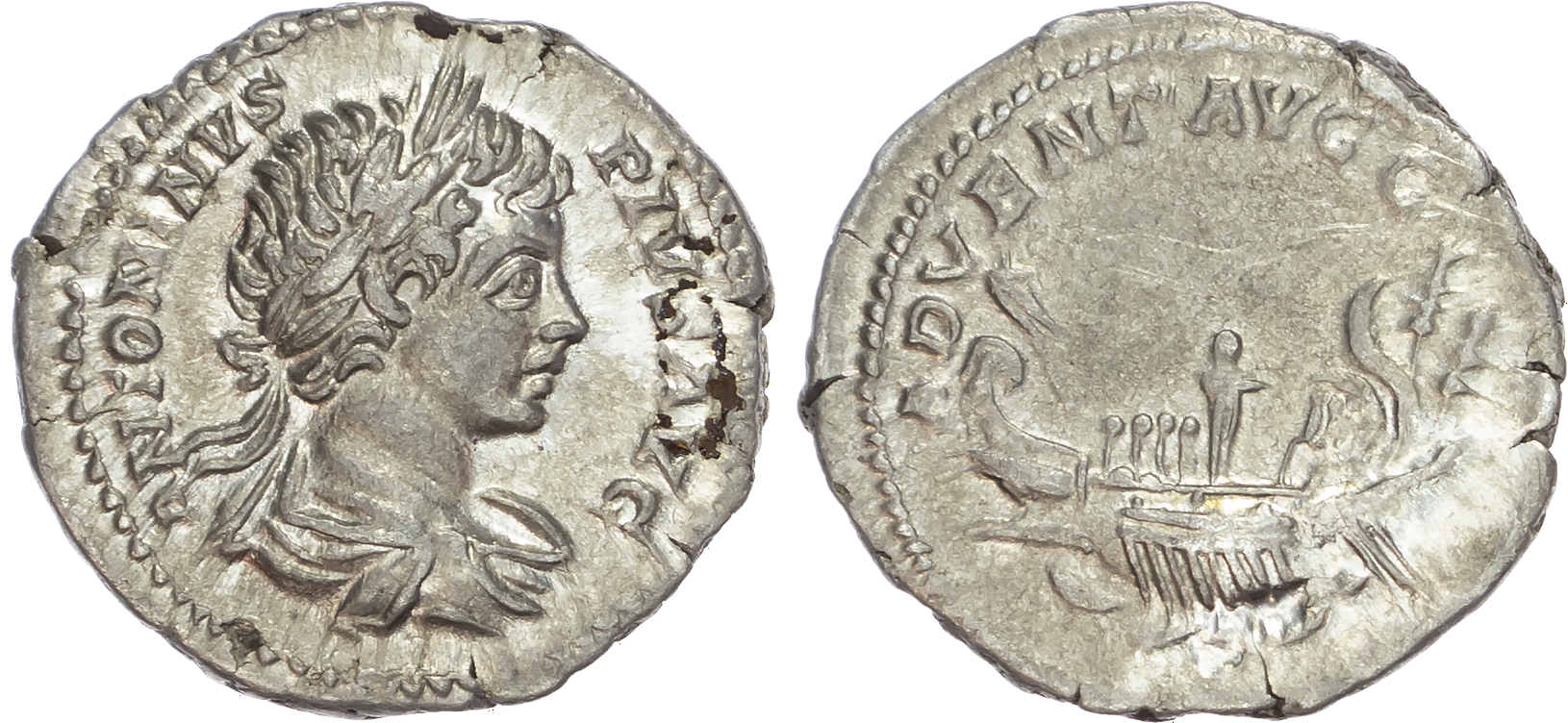 Caracalla (AD 198-217) Silver Denarius, Rome, AD 201-206, 3.13g. Obverse: ANTONINVS PIVS AVG, laureate and draped bust of Caracalla right. Reverse: ADVENT AVGG, galley sailing left. (RIC 120; BMC 267). About Extremely Fine.