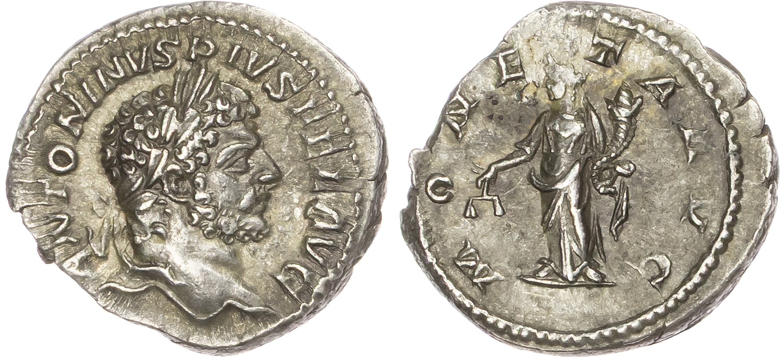 Caracalla (AD 198-217), Silver Denarius, Rome, AD 213, 3.34g. Obverse: Laureate bust of Caracalla right. Reverse: Moneta standing left with scales and cornucopia. (RIC IV.1 236; BMCRE 63; RSC 165). Very Fine.