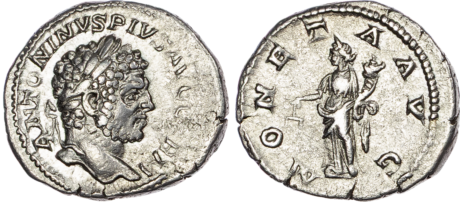 Caracalla (AD 198-217) AR Denarius, Rome, AD 213-217, 3.21g. ANTONINVS PIVS AVG GERM, laureate head of Caracalla right. Rev. MONETA AVG, Moneta standing left, holding scales and cornucopiae. (RIC 308). Good Very Fine.