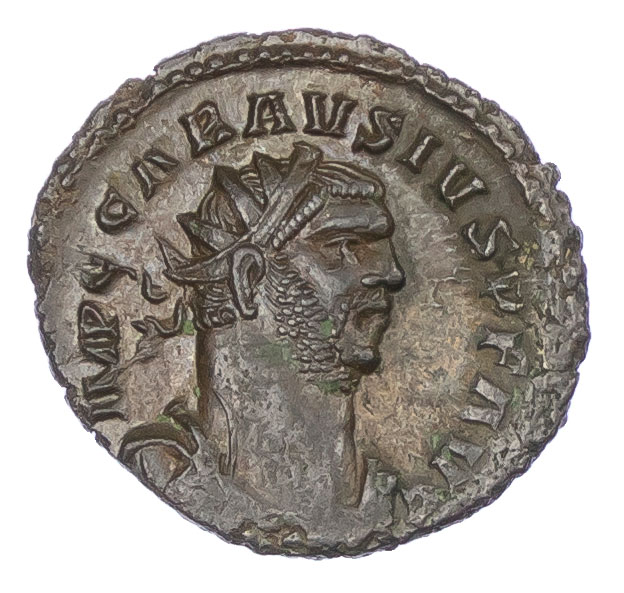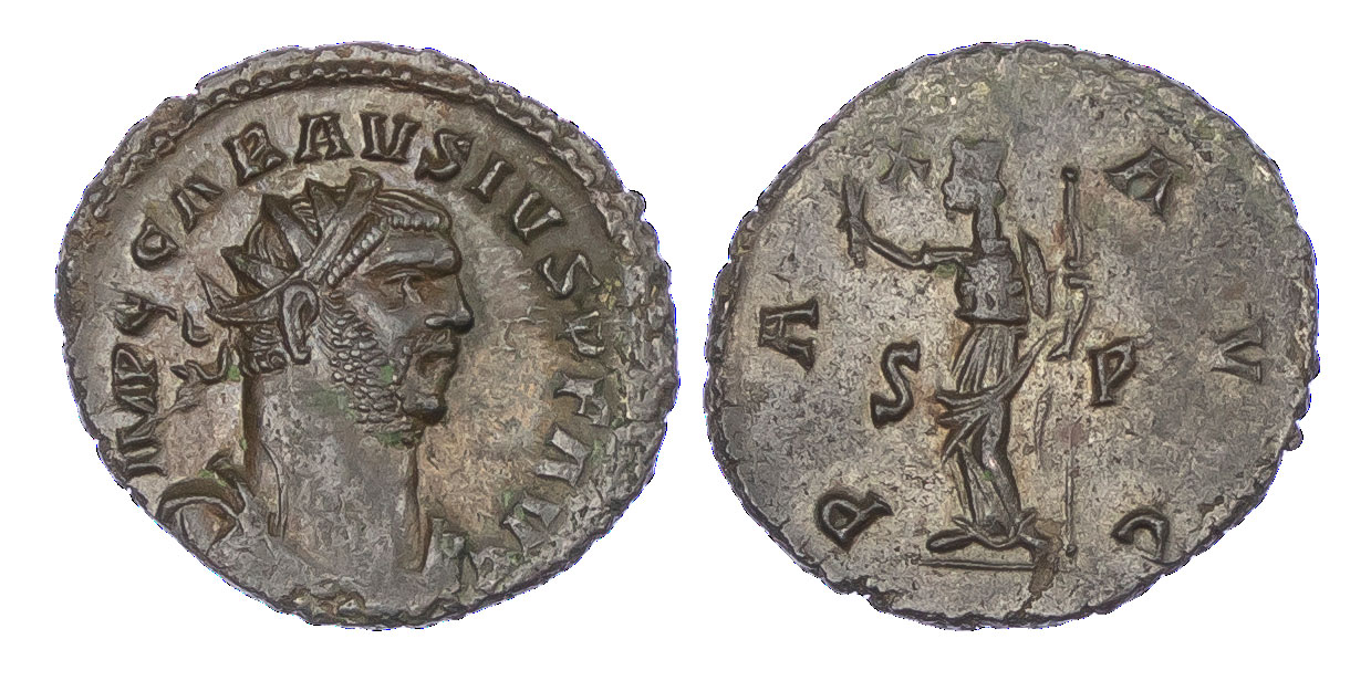 Obverse: IMP C CARAVSIVS P F AVG, radiate, draped and cuirassed bust of Carausius facing right.