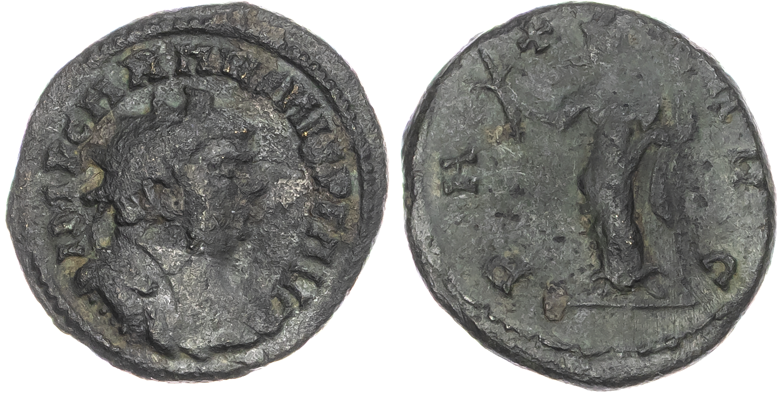 Carausius (287-293 AD), Bronze Antoninianus, London, AD 286-293, 3.34g. Obverse: Radiate and draped bust of Carausius right. Reverse: Pax standing holding olive branch in her right hand and scepter in her left. (RIC 890). Very Fine.