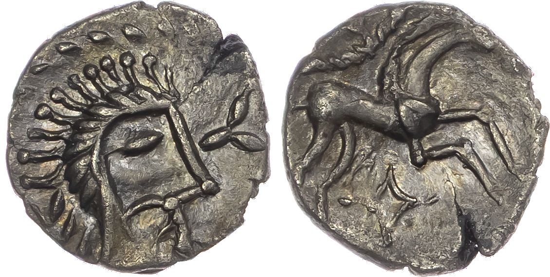 Iceni, Uninscribed (c. 20 BC – AD 10) AR Unit, ‘Norfolk God’ type, 1.18g. Stylised head right, with spiked hair. Rev: Stylised horse right, lozenge below. (ABC 1567; VA 792; BMC 3605-3759). Extremely Fine.