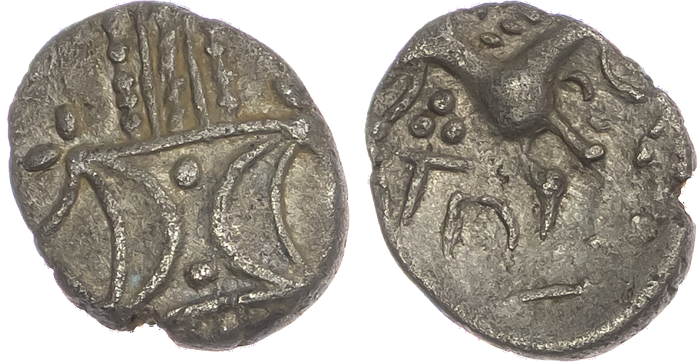 Iceni, Anted (AD 10-30) AR Unit, 1.05g. Two opposed crescents with pellets between, superimposed upon band of three lines surrounded by two lines of pellets. Rev. Celticized horse springing right;… Read more
