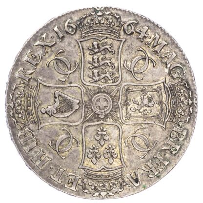 Charles II (1660-85), Crown, 1664, second laureate and draped bust right, toothed border both sides, legend surrounding, CAROLVS II DEI GRATIA. Rev, crowned cruciform shields, interlinked pairs of Cs in angles, garter star at centre, date either side of top crown, seven strings to Irish harp MAG BR FRA ET HIB REX. Edge inscribed in raised letters, DECVS ET TVTAMEN ANNO REGNI XVI, struck on a smaller module flan (S.3355; ESC.28; Bull 362).
