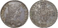 Charles II (1660‑85), Crown, 1677/6, edge VICESIMO NONO, third laureate and draped bust right. Rev, crowned cruciform shields interlinked Cs in angles, garter star at centre, eight strings to Irish harp, date flanking top crown, (S.3358; Bull.399; ESC.53). Good very fine or better toned, hair detail better than usual. Slight weight adjustment on reverse.