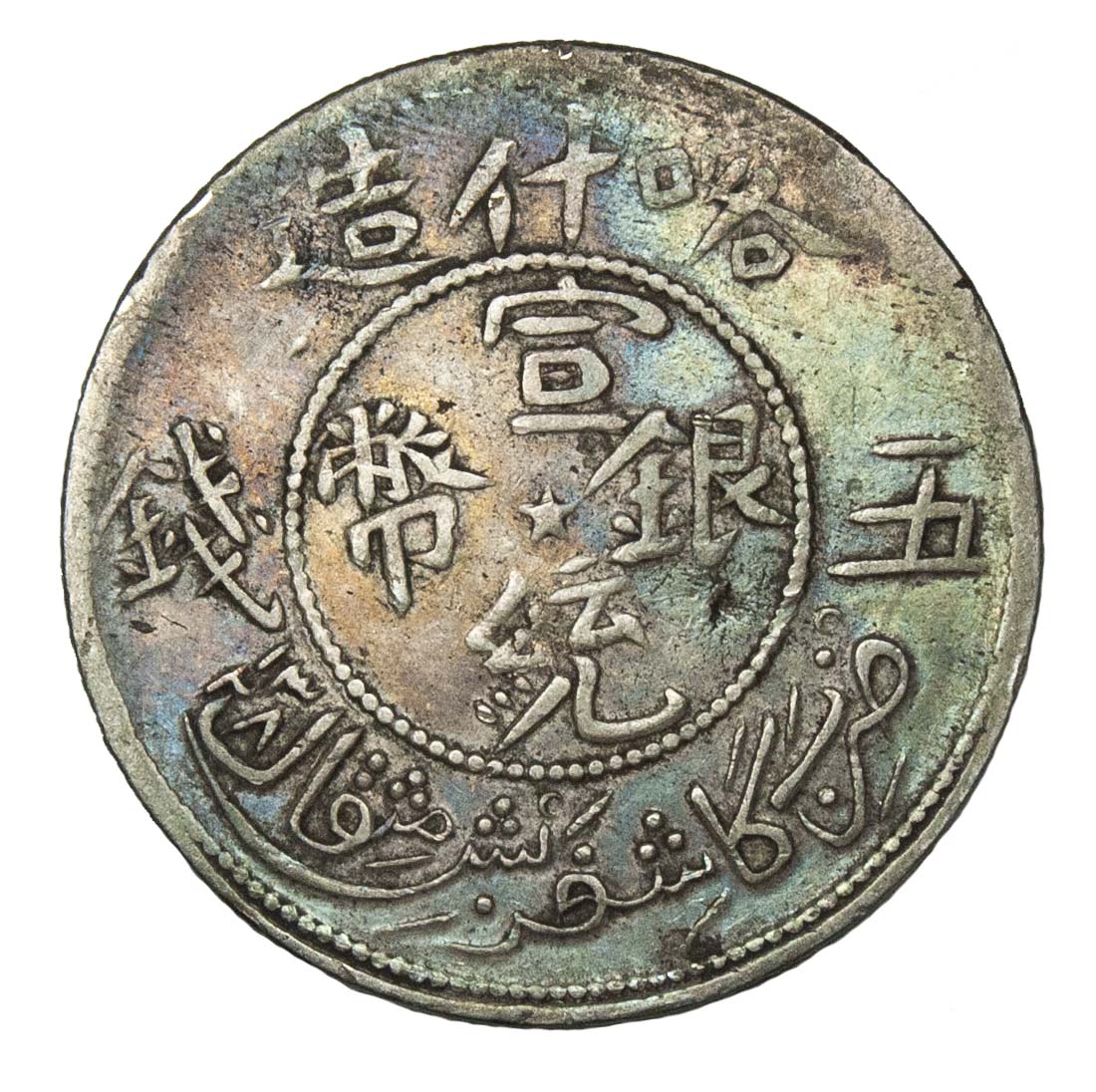 China, Sinkiang, silver 5 Mace, 1327h / 1909-10 AD, small stars around dragon (L&M 754).