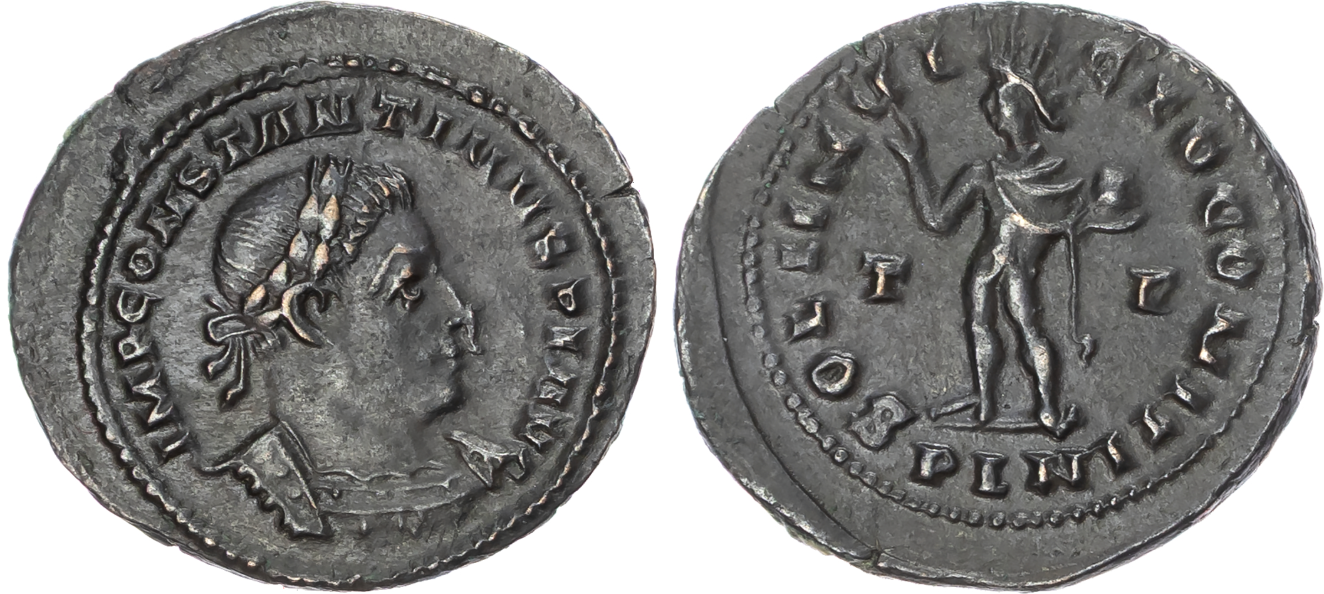 Constantine I (AD 306-337) Bronze Follis, London, AD 310, 5.10g. Obverse: Cuirassed and laureate bust of Constantine right. Reverse: Sol standing left, radiate, nude but for chlamys draped across shoulder,… Read more