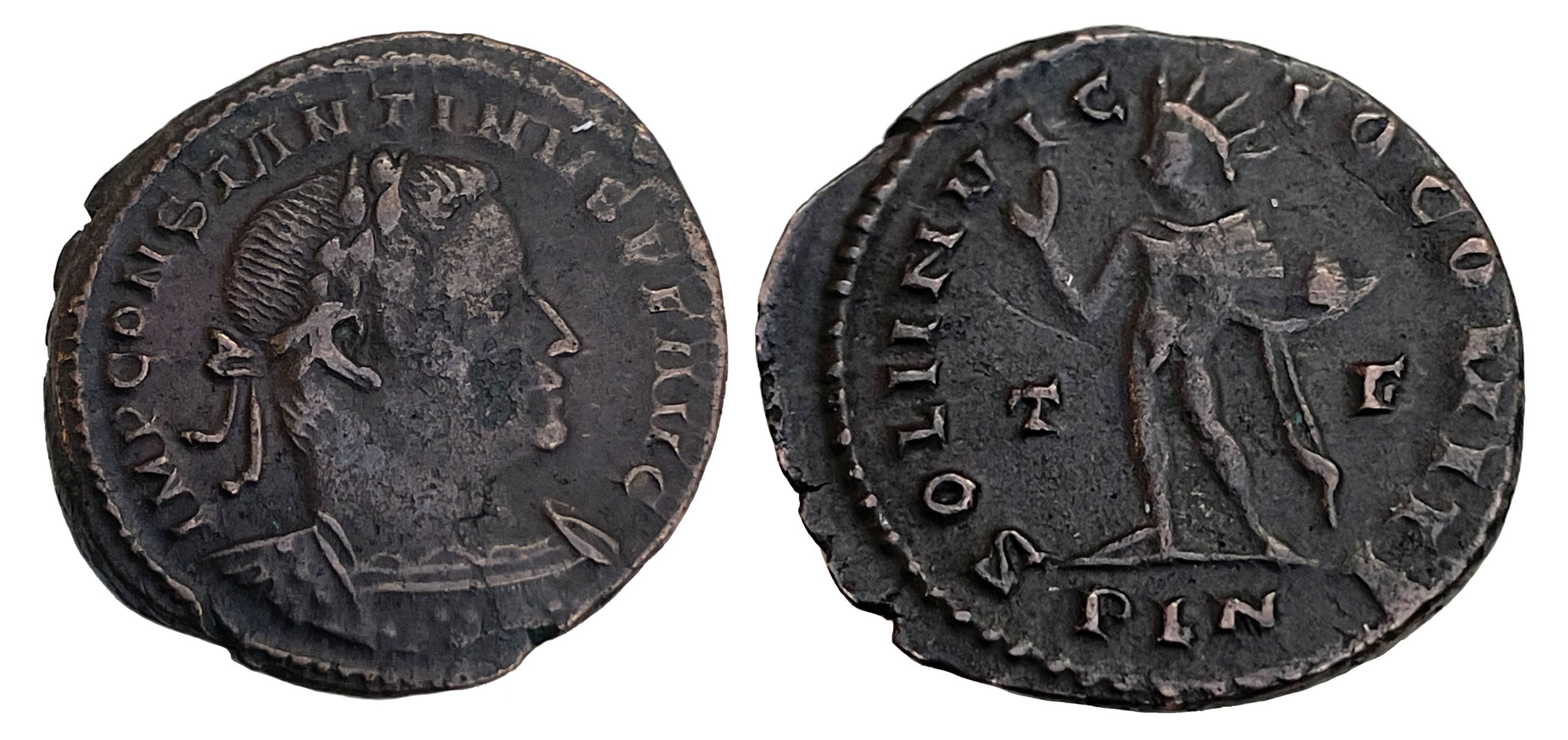 Constantine I (AD 306-337), London Mint Follis, AD 309-311, 4.57g. Obverse: Laureate and cuirassed bust of Constantine right. Reverse: Sol standing left, holding globe and raising hand, PLN (London mint… Read more