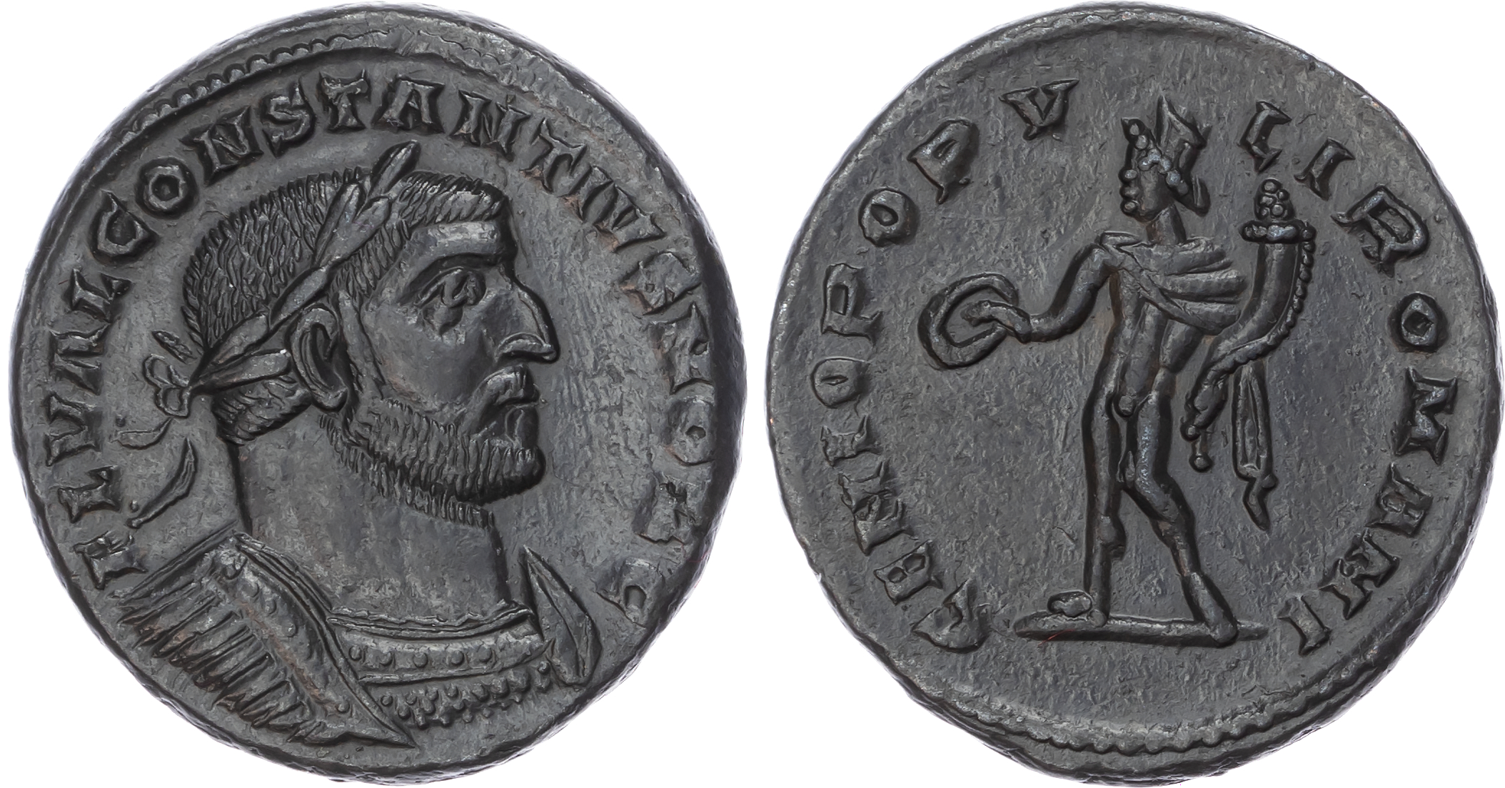 Constantine I, as Caesar (AD 293-305) Bronze Follis, London, AD 296-297, 10.07g.Obverse: FL VAL CONSTANTIVS NOB C, laureate bust of Constantius I right. Reverse: GENIO POPV-LI-ROMANI, Genius standing left, holding patera and cornucopiae. (RIC 30; C&T 10.05.009). Good Very Fine or better. Pleasing black toning.