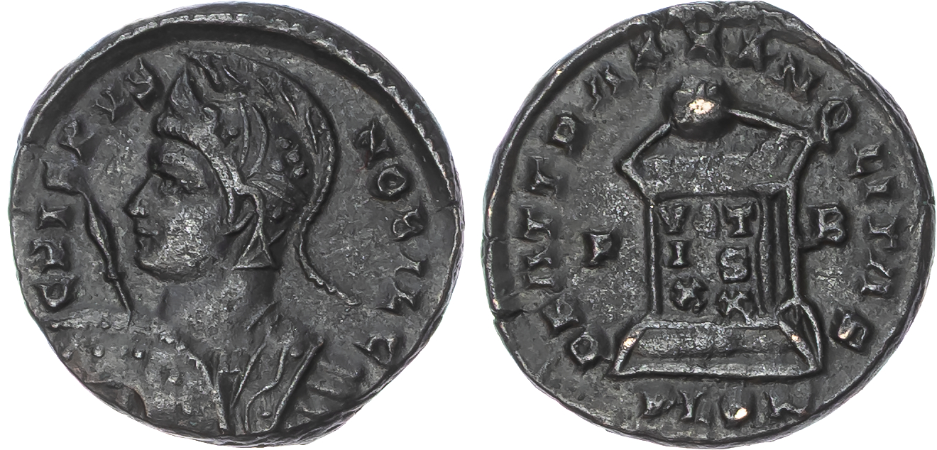 Crispus as Caesar, Bronze Follis, London, AD 322-323, 3.64g. Obverse: Helmeted and cuirassed bust of Crispus left, holding shield and spear.Reverse: Globe set on altar inscribed. (RIC 250). About Extremely Fine.
