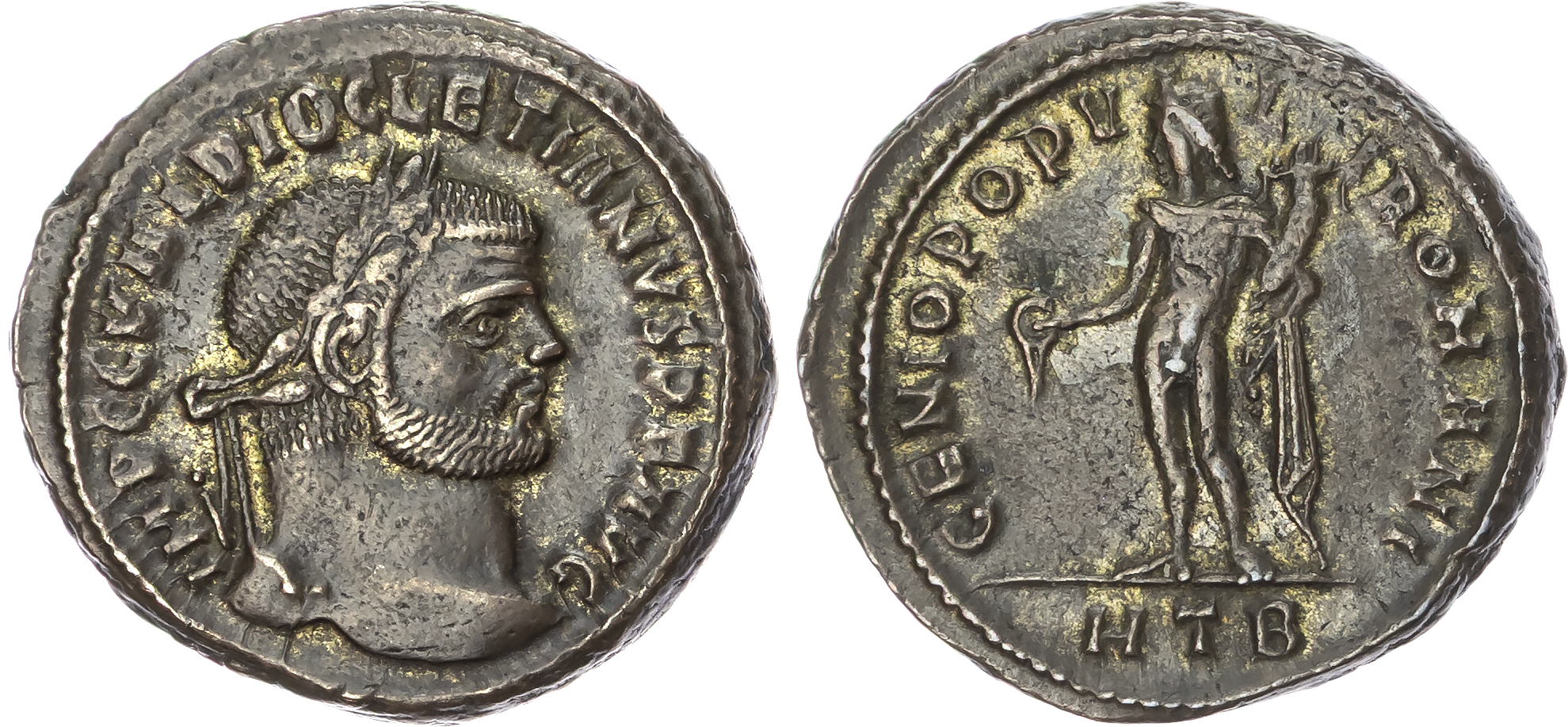 Diocletian (AD 184-305) Bronze Follis, Heraclea, AD 296-297,10.67g. Obverse: Laureate head of Diocletian right. Reverse: Genius standing holding patera from which liquor flows and cornucopia. (RIC 17a). Very Fine.
