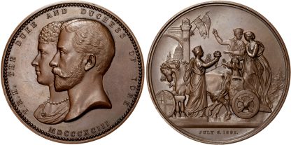 Duke and Duchess of York, Visit to the City of London, copper medal (76mm/236.24gm) 1893 by G. G. Adams for the Corporation of the City of London. Conjoined busts left. Rev, the couple in antique biga greeted by Londonia (Eimer 1780; BHM 3452). Good Extremely Fine, a few trifling marks, no case. Only 400 specimens struck.