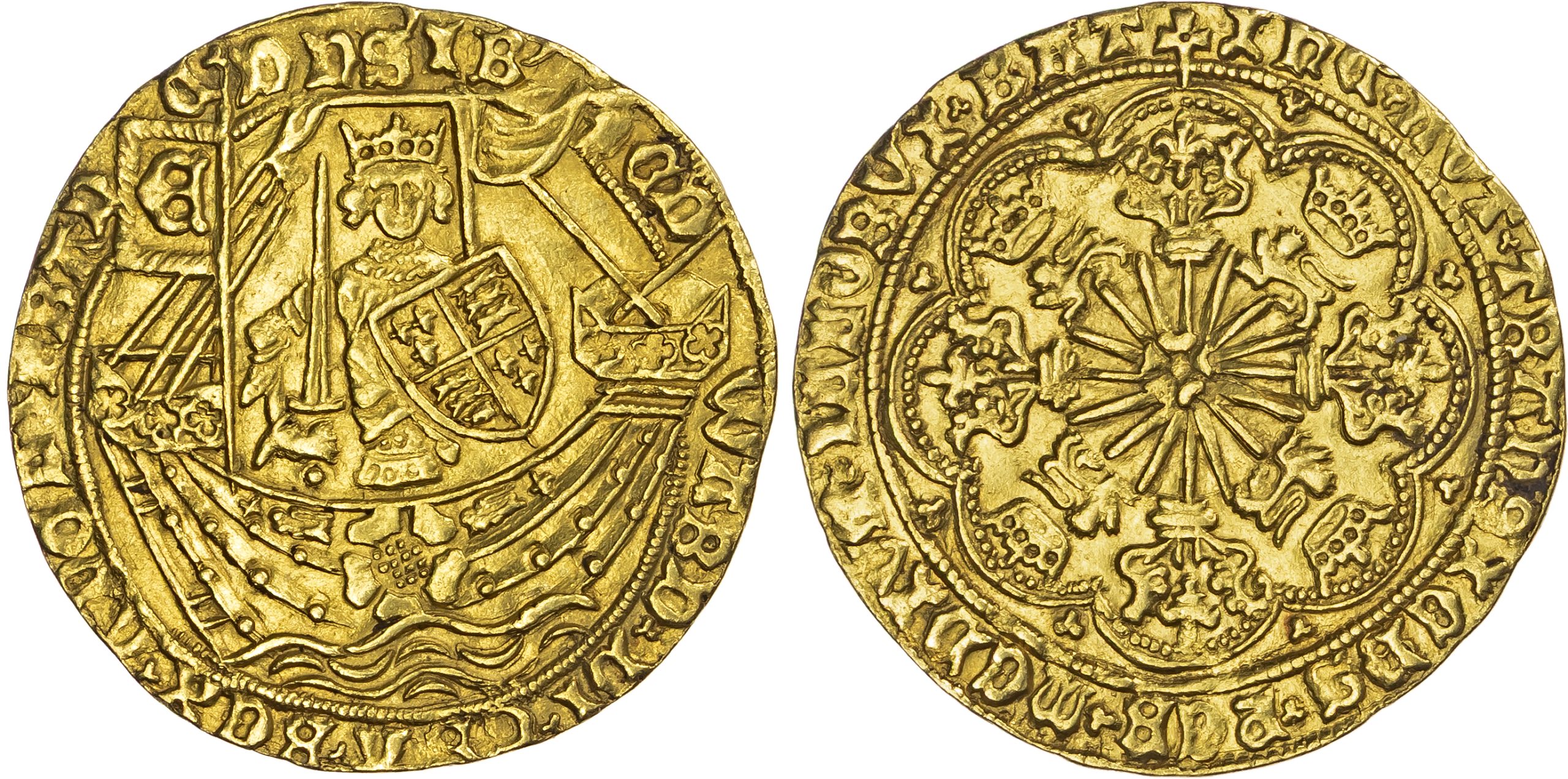 Edward IV (First Reign, 1461‐1470), Gold Ryal or rose‐noble, Light Coinage, Tower (London) mint, mm. long cross fitchee (1469‐70).Edward crowned, facing, on ship, holding sword and shield, rose on hull, banner with E at stern, Rev. Trefoil stops, sixteen rayed sun, rose at centre, ornamental cross terminals ending in lis, crown over lion in each angle, within beaded and linear tressures of eight arcs, trefoils in spandrels, 7.66g/7h. (N. 1549; S. 1951). Almost Extremely Fine.