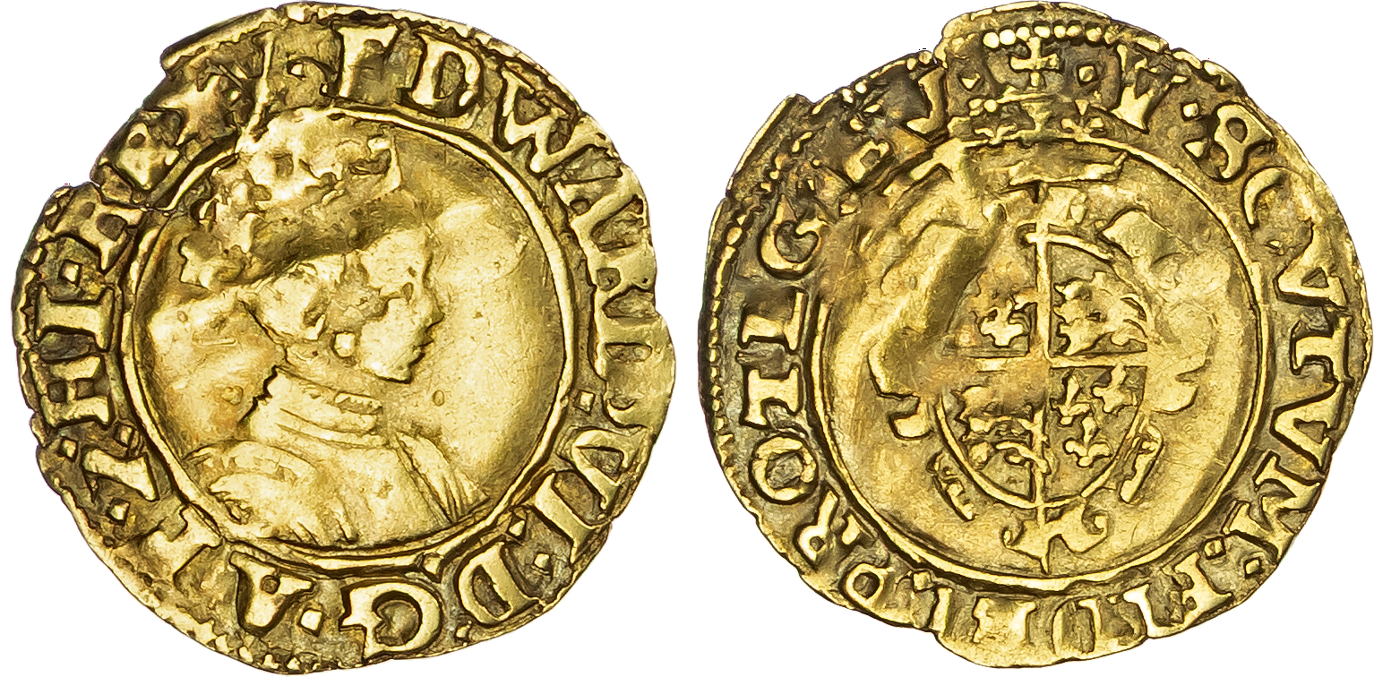 Edward VI (1547‐1553), Gold Halfcrown, Second Period (1549‐50), Southwark mint, mm. Y. Crowned bust right, Rev. Crowned and garnished shield, 1.38g/2h. (North 1916; S. 2444; Schn. ‐). Very Fine. Edge slightly irregular at 11h, with some wave to flan. An extremely rare denomination of Edward VI, seldom turning up.