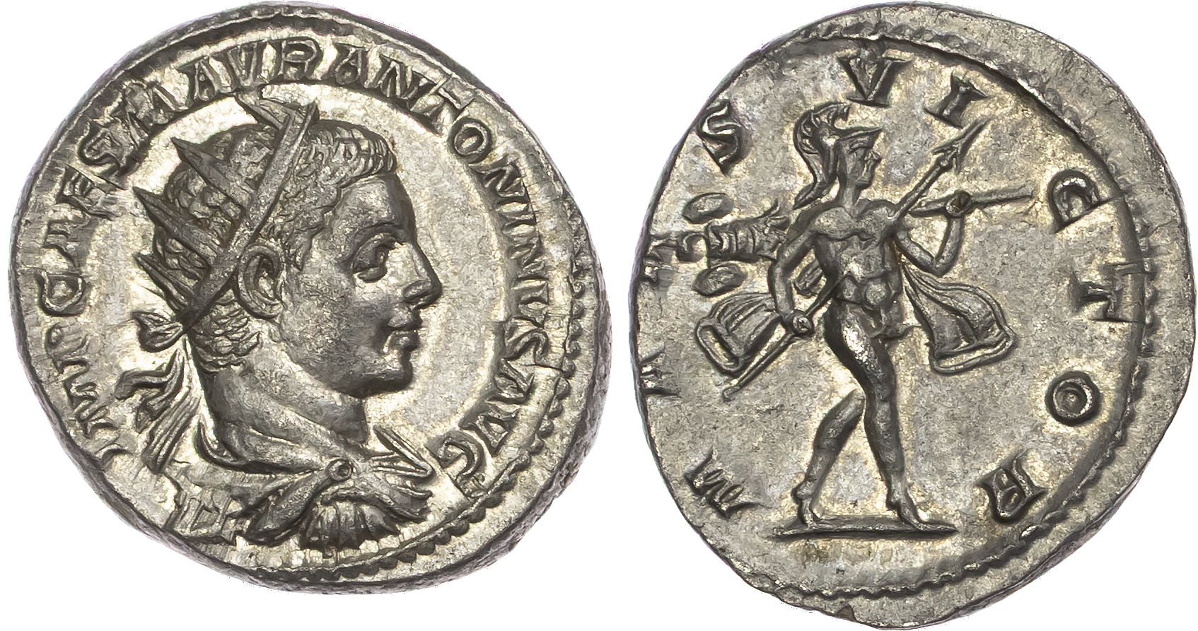 Elagabalus (AD 218-222) AR Antoninianus, Rome, AD 218, 5.43g. IMP CAES M AVR ANTONINVS AVG, radiate, draped and cuirassed bust of Elagabalus right. Rev. MARS VICTOR, Mars advancing right, holding spear, and trophy over shoulder. (RIC 122; RSC 113). Good Extremely Fine.