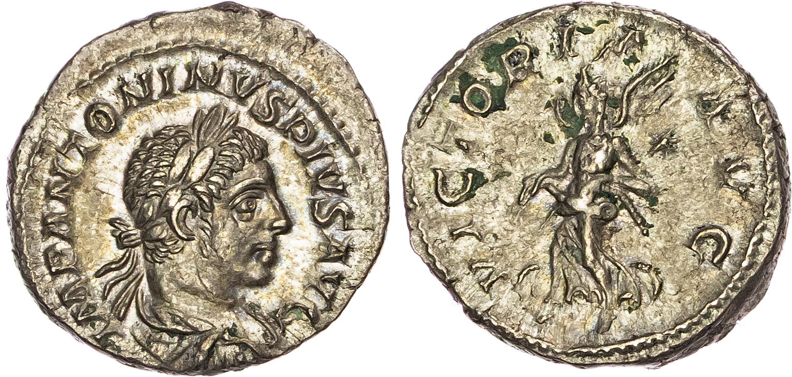 Elagabalus(AD 218-222), Silver Denarius, Rome, AD 220-221, 3.18g. Obverse: Laureate and draped bust of Elagabalus right. Reverse: Victory flying left, holding diadem in both hands, two small shields either side and a star in right field. (RIC 161). Very Fine.