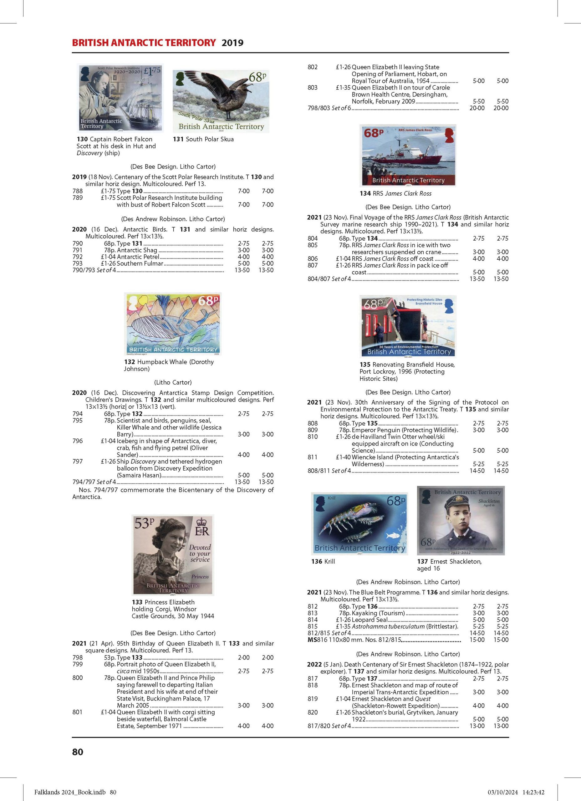 This catalogue lists and prices the stamps of the Falkland Islands, Falkland Islands Dependencies, South Georgia, British Antarctic Territory and South Georgia and South Sandwich Islands.
