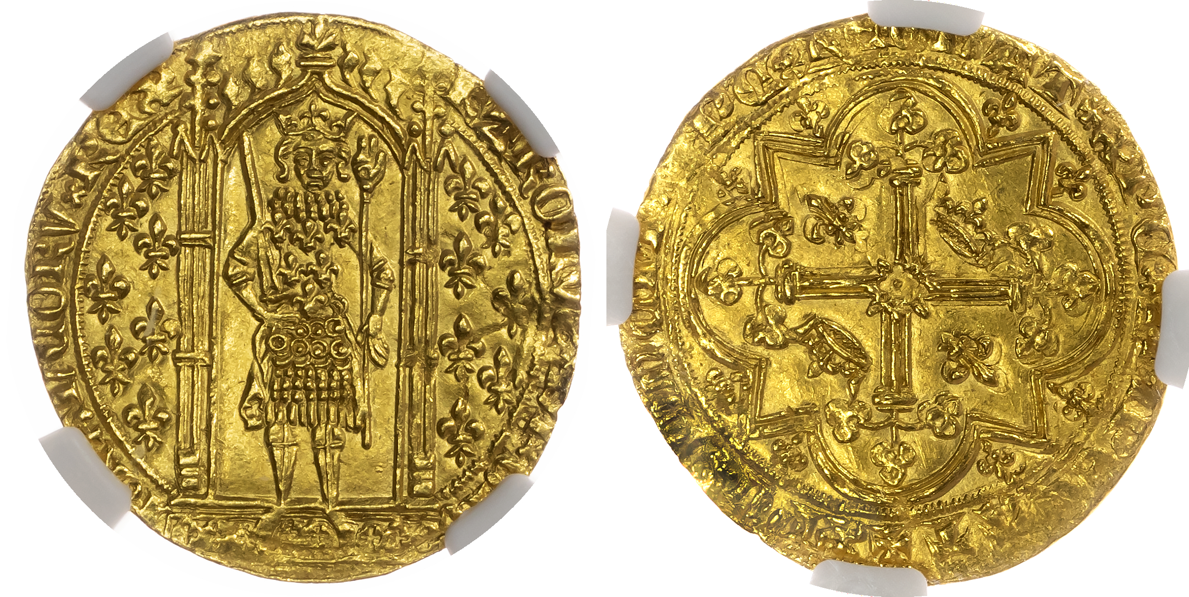 France, Charles V (1364-1380), gold Franc à pied, no date (1365), Paris, 3.84g (Dy. 360; Fr. 284). In NGC holder graded MS 63 (6532187-038).