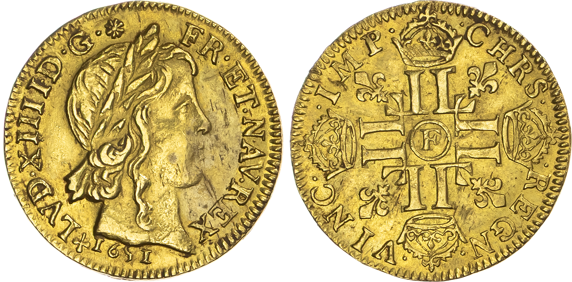 France, Louis XIV (1643-1715), Louis d’or, 1651 F, Angers, 6.68g (Dy. 1422). About Extremely Fine, traces of rolling from striking process on obverse with some discoloration and marks. These are typical of coins struck in Angers. Extremely rare as only 1,269 pieces of Louis d’or coins were struck in Angers in this year.