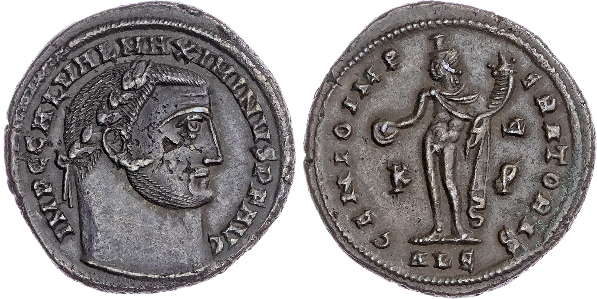 Galerius (AD 305-311) AE Follis, Alexandria, AD 308-310, 6.83g. Obverse: Laureate head of Galerius right. Reverse: Genius standing left, holding patera and cornucopia, K-P in field. (RIC 101a). Very Fine.