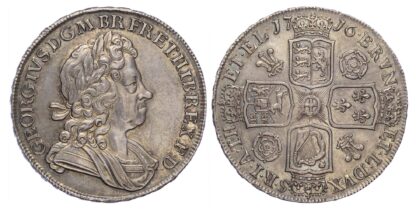 With the accession of the House of Hanover, the coinage remained in essence the same, with the exception of adjustments to the Royal titles and the Royal Arms. The combined legend inscription translates to the following, ‘By the grace of God, King of Great Britain, France and Ireland, Defender of the faith, Duke of Brunswick and Luneberg, arch treasurer and Elector of the Holy Roman Empire.’