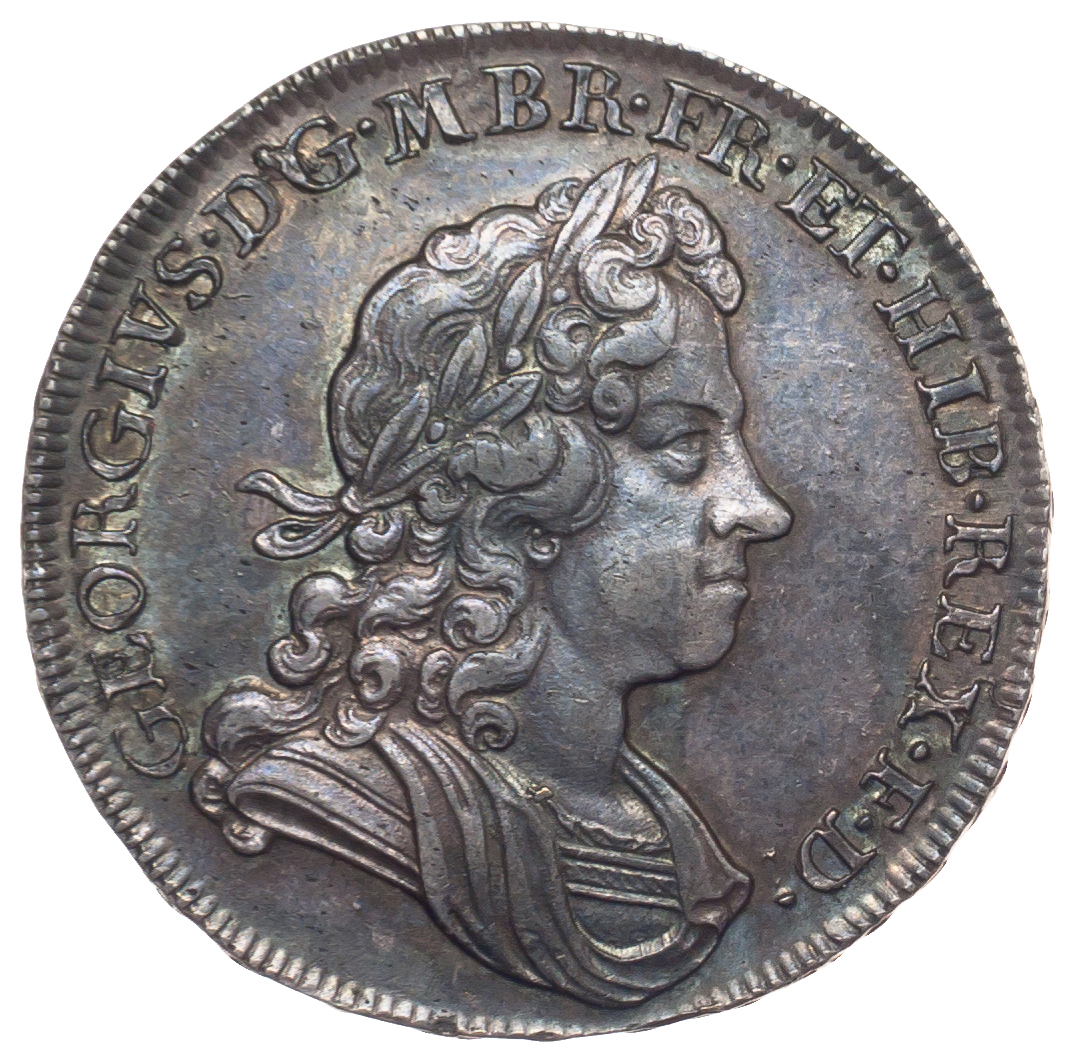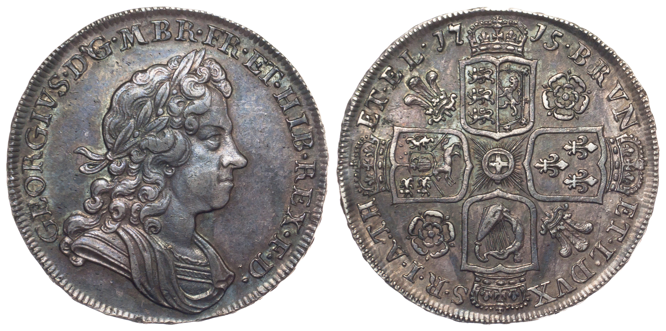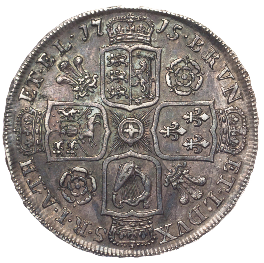 George I (1714-27). Halfcrown, 1715, laureate and draped bust right. Rev, crowned cruciform shields, roses and plumes in angles, garter star at centre, date above, edge inscribed in raised letters and dated SECVNDO, this last O incompletely struck appearing as C. (ESC.589; S.3642).