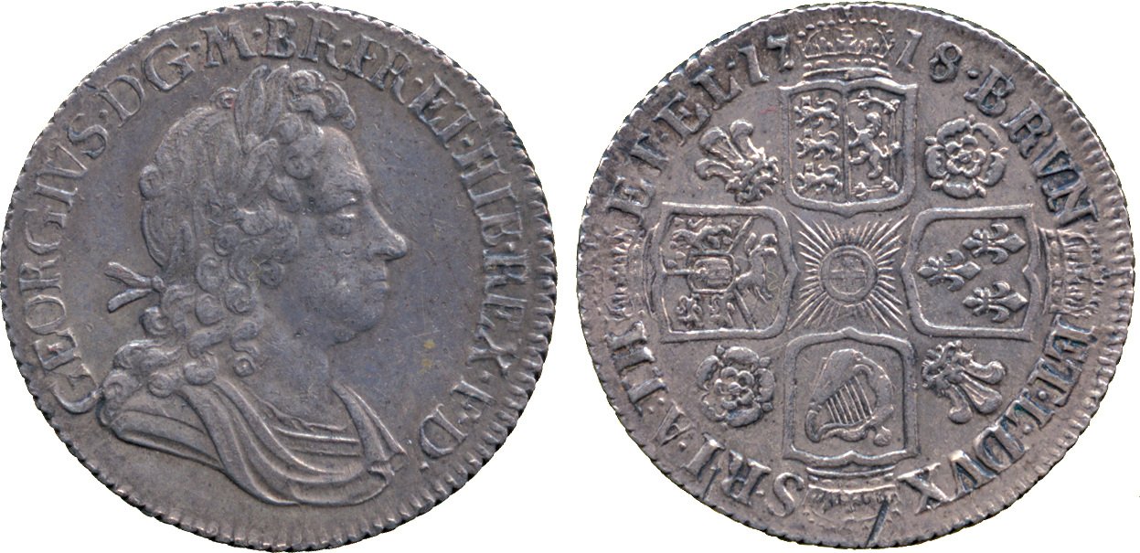George I (1714-27), Shilling, 1718, first laureate and draped bust right, rev crowned shields, garter star at centre, roses and plumes in angles, edge milled (ESC.1165; S.3645).