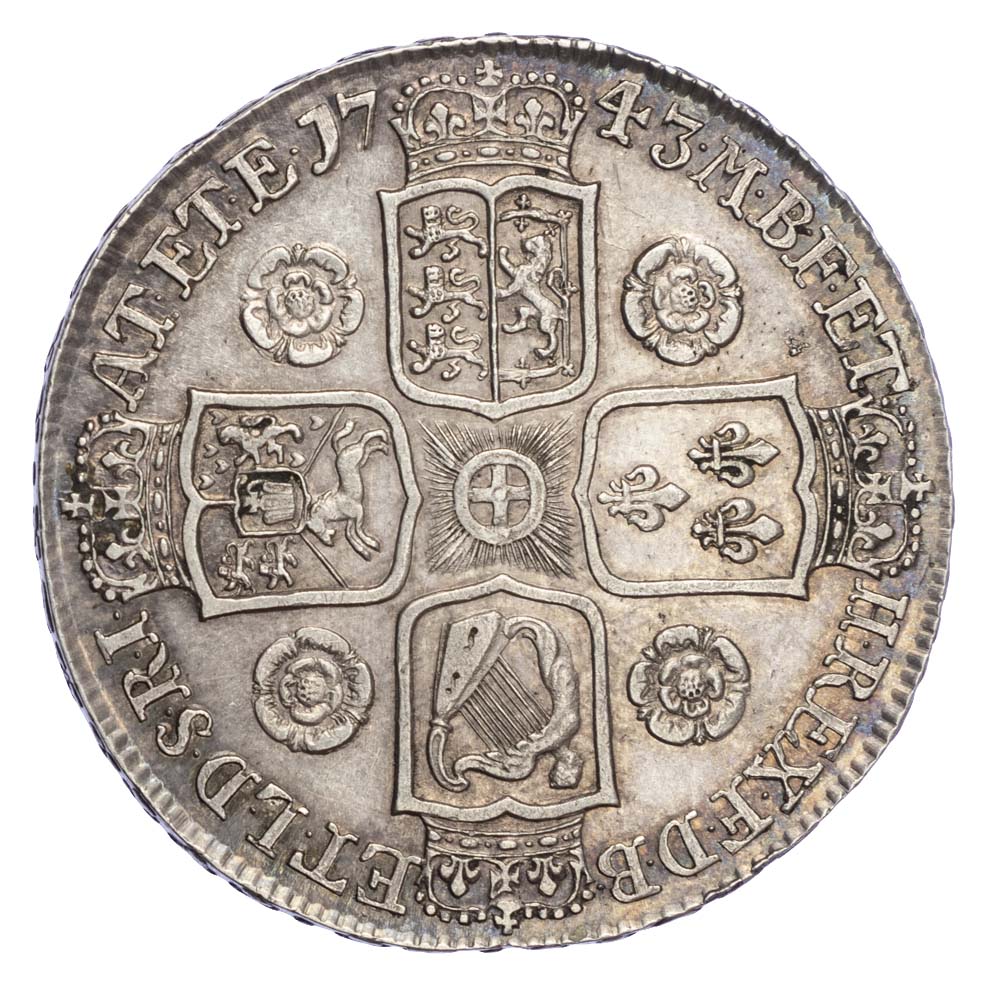George II (1727-60), Crown, 1743, older laureate and draped bust left, toothed border surrounding both sides, legend commences GEORGIUS II DEI GRATIA. Rev, crowned cruciform shields, ten strings to Irish harp, roses struck in angles, garter star at centre, legend surrounds M.B.F.ET.H. REX. F.D.B. ET.L.D.S.R.I.A.T ET.E, edge inscription DECVS ET TVTAMEN ANNO REGNI DECIMO SEPTIMO (S.3688; ESC. 124; Bull 1667).