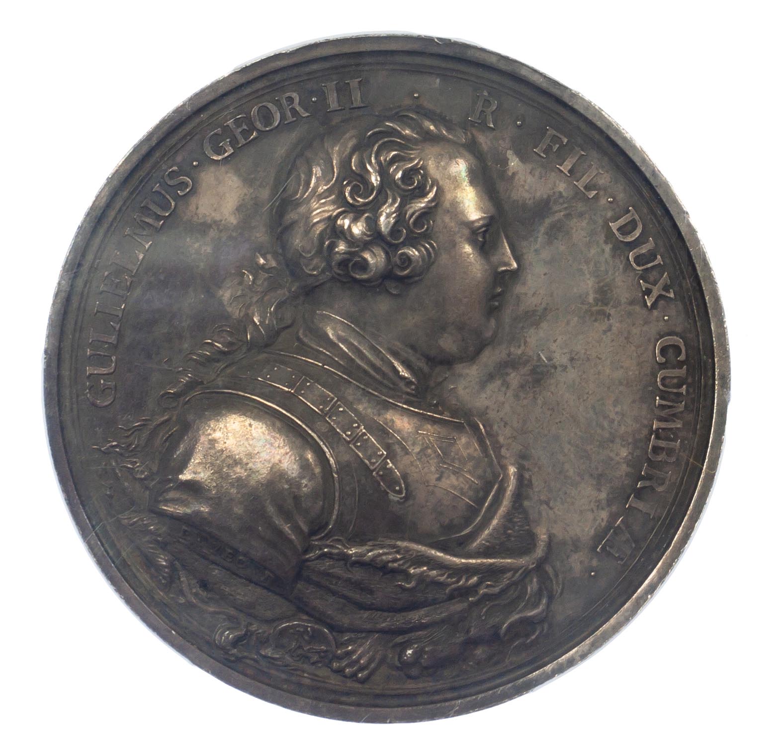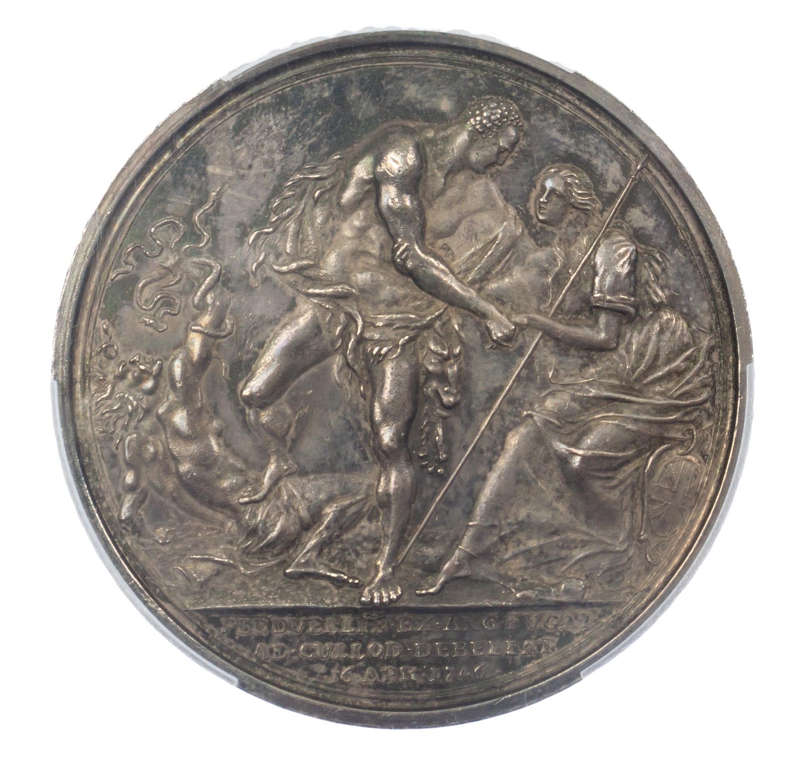 George II, Battle of Culloden. AR medal 1746 (50mm.) by R. Yeo. Armoured bust of the Duke of Cumberland right, GULIELMUS GEOR II R FIL DUX CUMBRIAE. Rev. Cumberland, as Hercules, raising Britannia to her feet while trampling Discord in the person of the Young Pretender. (Woolf 55:2; MI ii, 613/278; E 604).