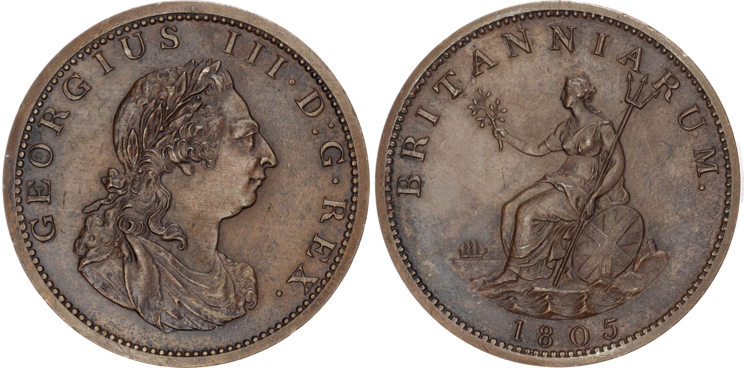 George III (1760-1820), AE Proof Restrike Twopence, 1805. Draped bust right, four berries in hair, brooch of seven jewels, K without dot, Rev. Britannia seated left on rock with shield and trident, edge plain, 52.21g/6h (BMC 1313 [R 94]). About as struck, with some striations on the obverse from the original die used, consistent with restrike proofs. Very scarce.