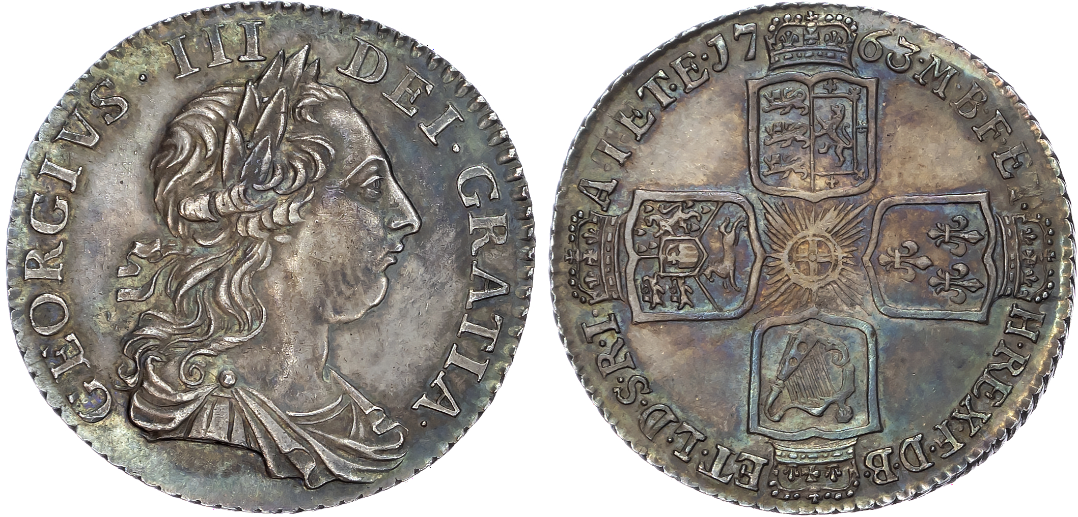 George III (1760-1820), Early Coinage, AR ‘Northumberland’ Shilling, 1763. Young laureate and draped bust left, Rev., Crowned cruciform shields, 6.09g/6h. (Bull 2124; ESC 1214; S. 3742). Good Extremely Fine, deeply toned.