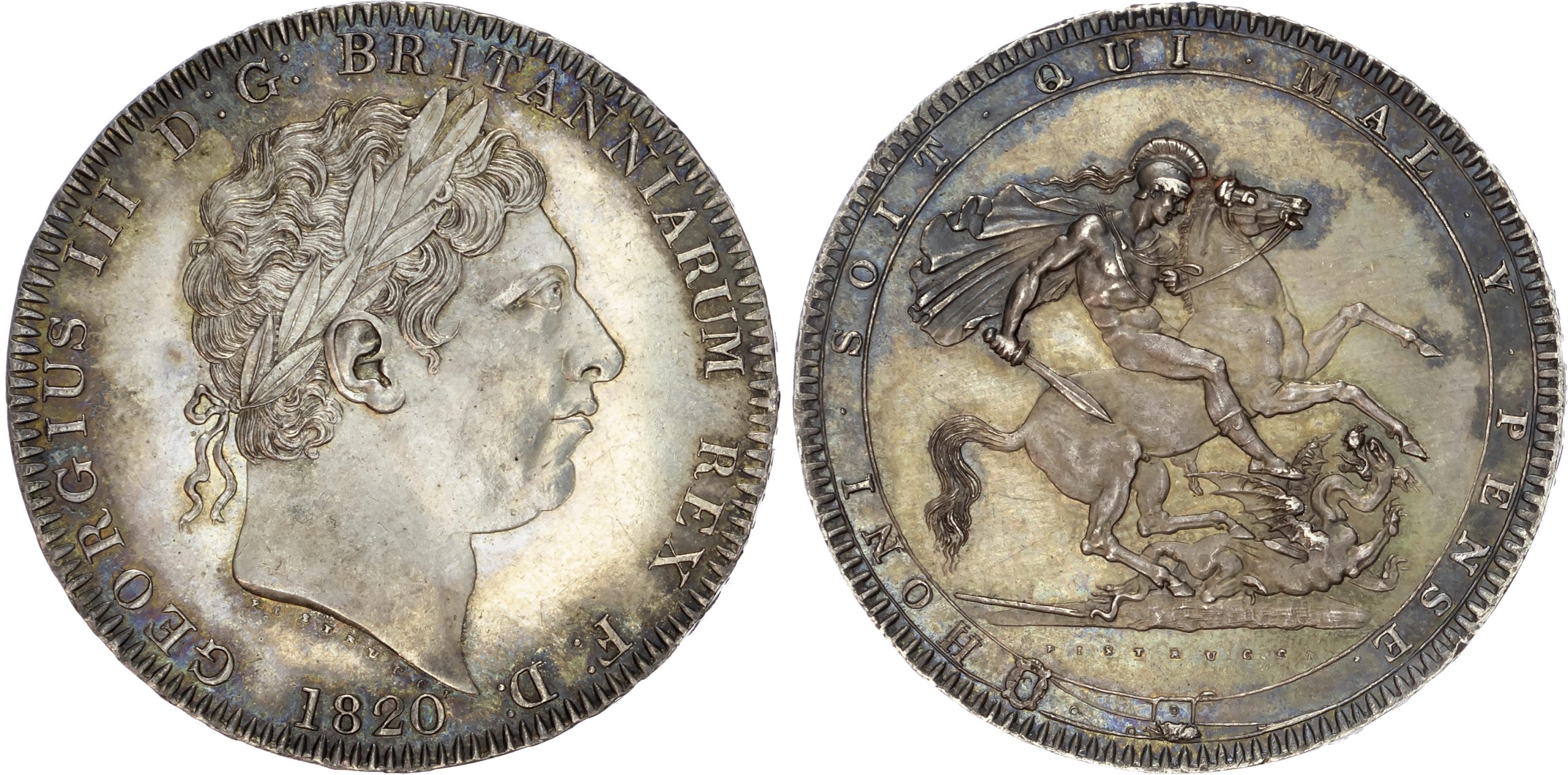 George III (1760-1820), Last Coinage (1816-1820), AR Crown, 1820, LX. Laureate head right, Rev. St. George slaying the dragon within garter, 28.31g/6h. (Bull 2016; ESC 219; S. 3787). Almost Uncirculated, obverse better. Attractively toned.