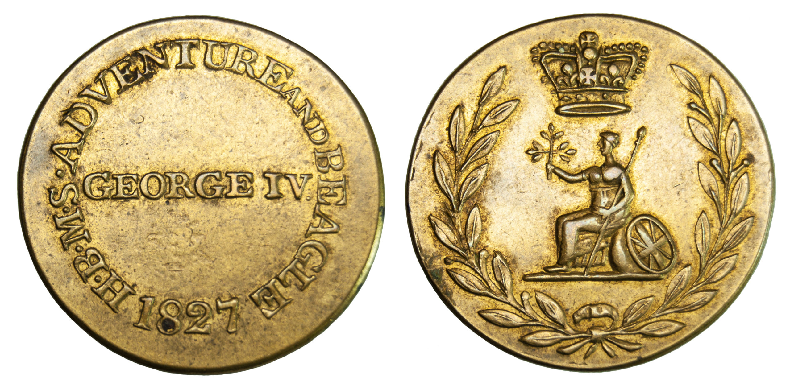 George IV, The Adventure and Beagle, 1826, brass medalet, GEORGE IV, HBMS ADVENTURE AND BEAGLE 1827 around, rev. crowned Britannia within wreath (BHM 1262; Ei. 1188; MH 579).
