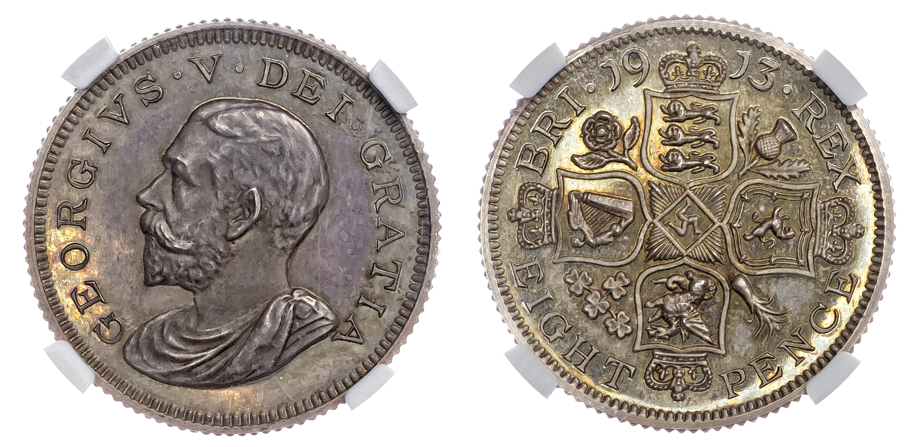 George V (1910‐1936), Pattern Octorino (8d) in silver, 1913, by Pinches for R. Huth. NGC PF 63.Draped bust left. Rev, cruciform shields, edge grained, (ESC 1482, Bull 3859). Encapsulated by NGC as PF63.