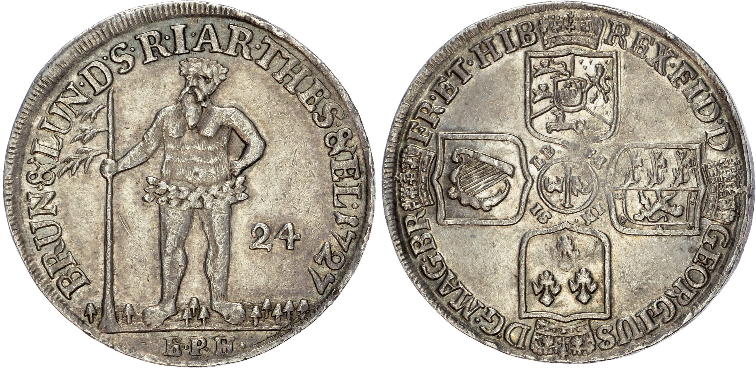 Germany , Brunswick-Lüneburg-Calenberg-Hannover, silver 24 Groschen / 2/3 Taler, 1727 EPH, in the name of George I as King of Great Britain and Elector, 13.00g (KM 187). About Extremely Fine, cleaned in the past.