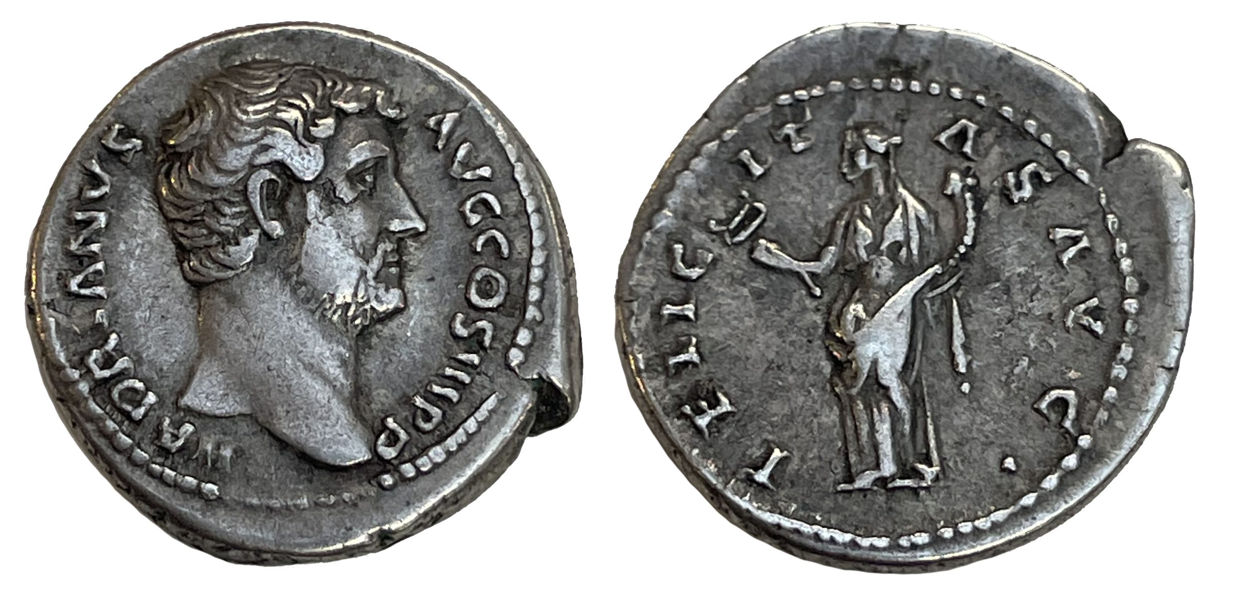 Hadrian (AD 117-138), Silver Denarius, Rome, c. AD 133-135, 3.26g. Obverse: Bare head of Hadrian right. Reverse: Felicitas standing left, holding caduceus and cornucopiae. (RIC 2039). Good Very Fine.