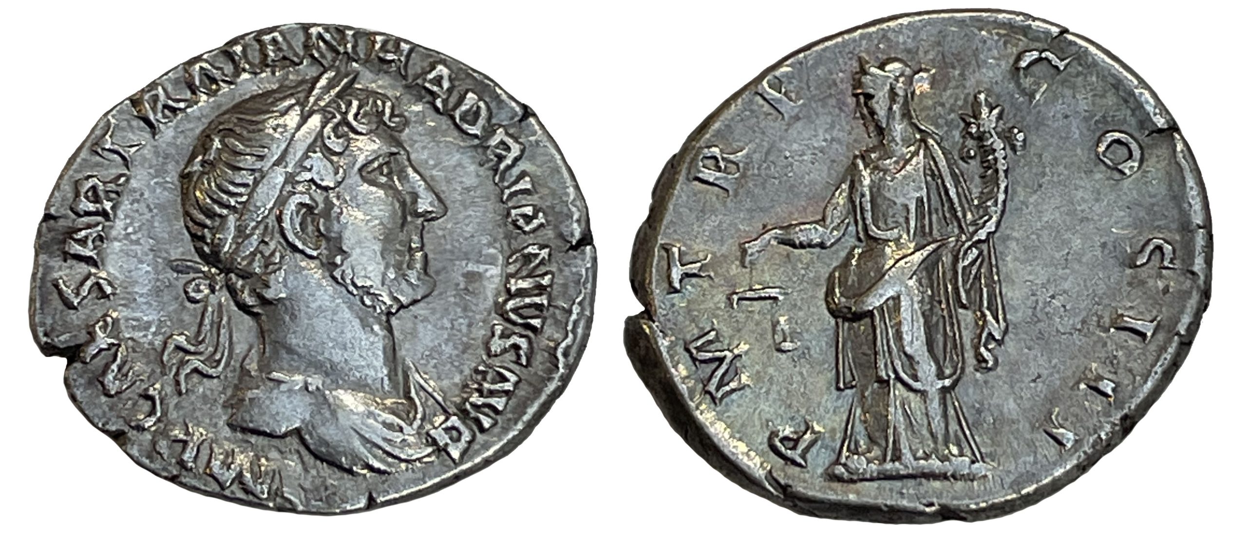 Hadrian (AD 117-138), Silver Denarius, Rome, c. AD 120-121, 2.99g. Obverse: Laureate and draped bust of Hadrian right. Reverse: Aequitas standing left, holding scales and cornucopiae. (RIC 385). Very Fine.
