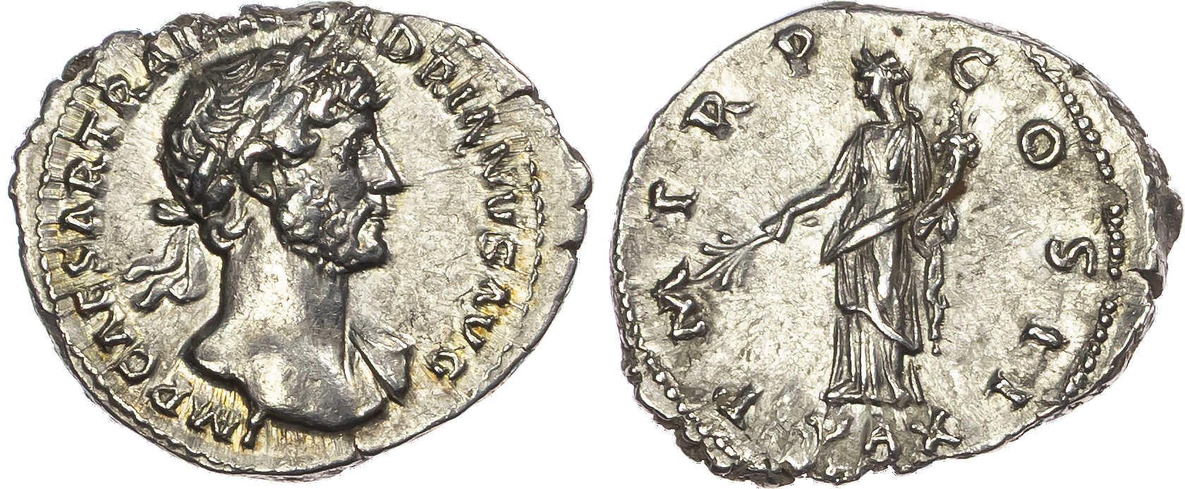 Hadrian (AD 117-138) AR Denarius, Rome, AD 118, 3.20g. IMP CAESAR TRAIAN HADRIANVS AVG, laureate head of Hadrian right. Rev. PM TR P COS II, Pax standing left, holding branch and cornucopiae, PAX in exergue. (RIC 44a; RSC 1015). Good Very Fine.