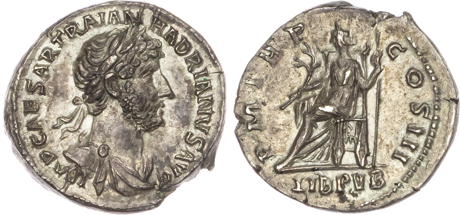 Hadrian (AD 117-138), Silver Denarius, Rome, AD 120-121, 3.48g. Obverse: Laureate, draped bust of Hadrian right. Reverse: Libertas seated left on throne, holding branch and sceptre. (RIC 363). About Extremely Fine.