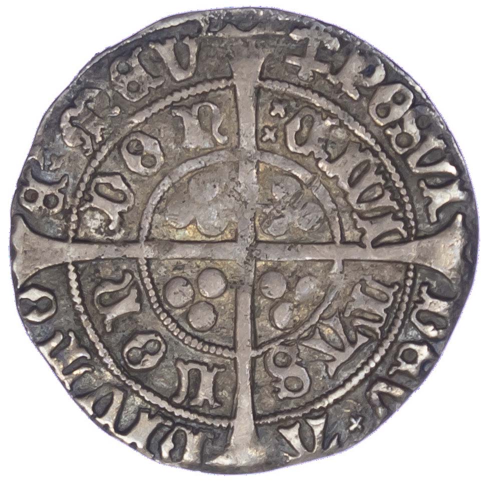 Henry VII (1485-1509), Groat, London mint, class IIIc, mintmark anchor (1499-1502), facing crowned bust, only outer arch of crown jewelled, five fleured cusps, saltire stops, legend surrounds HENRIC DI GRA REX ANGL Z FR. Rev, long cross fourchée, trefoil of pellets in angles, outer legends, reads POSVI DEV A DIVTOR E MEVM, inner script CIVITAS LONDON, 3.01g (S.2199; N.1705c).